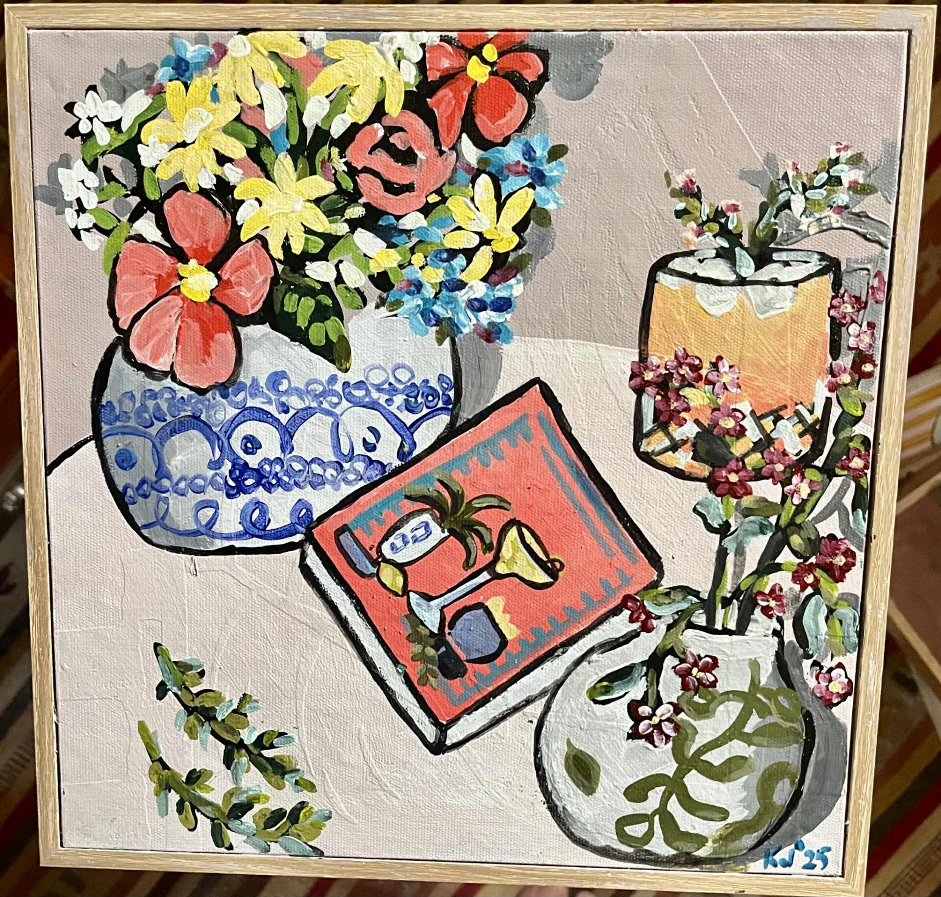 This piece presents a contemporary still life, featuring Kay Jamieson's cherished family heirloom cupboard, her pet cat Keith , set against a backdrop of native Australian florals and bold botanical motifs. Kay's style balances vibrant color with strong form, offering a modern interpretation of traditional still life themes. Through its layered textures and rich composition, the painting invites the viewer to appreciate the beauty of everyday abundance and the quiet elegance of nature.