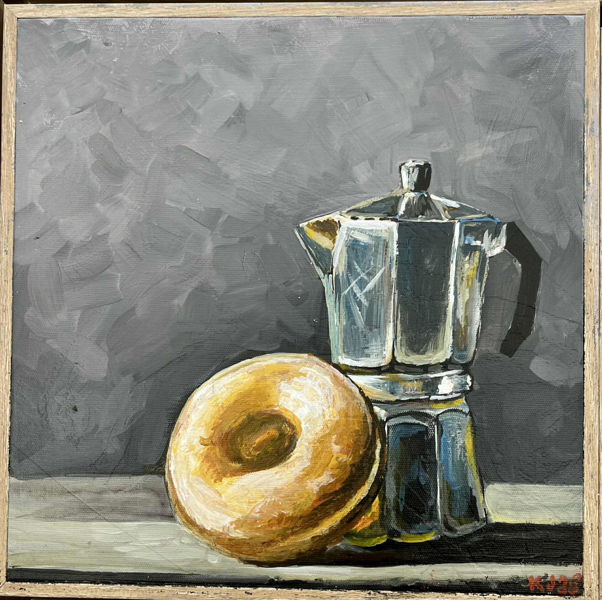 This still life captures the quiet intimacy of everyday ritual. Against a muted, textured grey backdrop, a silver percolator gleams with sharp reflections and subtle distortions of light, its angular form contrasted by the soft, golden roundness of a plain donut resting at its base. The juxtaposition of metal and bread, hard edges and gentle curves, creates a dialogue between durability and impermanence, routine and indulgence.